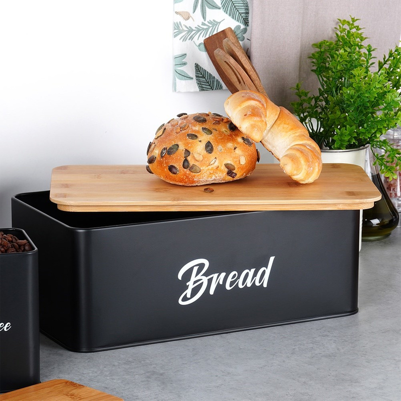 Set de cutie pentru pâine și 3 recipiente pentru cafea, ceai și zahăr – metal negru cu capac din bambus (4 piese)